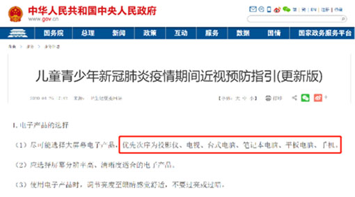 《指引》建議盡可能選擇大屏幕電子產(chǎn)品,優(yōu)先次序?yàn)橥队皟x、電視、臺(tái)式電腦、筆記本電腦、平板電腦、手機(jī)。
