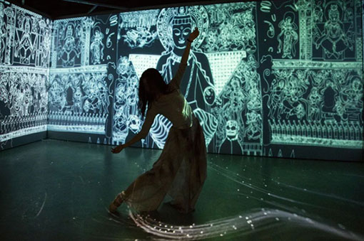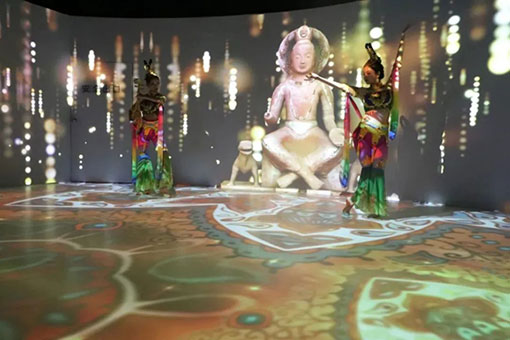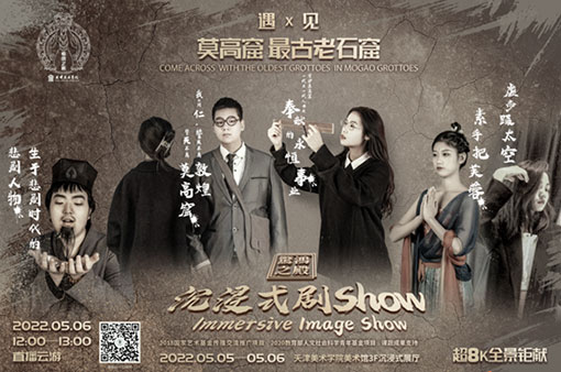 在天津美術學院美術館搭建的沉浸式展廳,以10K超高清影音視效結合話劇表演,全景展現敦煌最古老石窟的神秘故事和一代又一代堅守敦煌的感人故事。