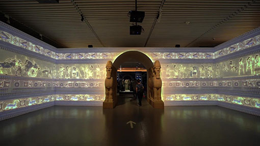 進(jìn)入展區(qū)的中心區(qū)域,可以看到通過投影和石像重現(xiàn)的亞述王宮拱門。拱門兩側(cè)矗立著兩頭2米高的人首翼牛像,4臺SNP-ELU520S展開了一幅幅亞述帝國的生活圖景,整個畫面原汁原味的還原了亞述風(fēng)情。