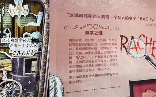 在此后的展廳中,《福爾摩斯探案集》中的數個知名案件流程呈現于眼前,每位敏銳的“偵探們”都需要將此前的線索與內容關聯,仔細尋找兇手的蹤跡。