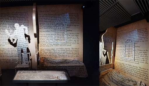 初入展館,柯南·道爾爵士的寫作成就及對后世的影響便被系統化的展現在我們眼前,展廳中央的索諾克投影機安靜地放映著道爾爵士的生平記述、創作的手稿及人物關系相片,要完成創作“福爾摩斯”這樣一部集大成之作,道爾爵士的閱歷之豐富、筆法思路之瑰異令人為之折服。