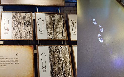 下一個展廳內,眾多案件偵破中的知識及技巧介紹琳瑯滿目,當我們醉心于一一體驗“摩斯電碼、土質鑒別、足跡分析”時,殊不知早已尾隨身后的“危險腳印”。來自頭頂的兩臺索諾克激光投影機恰逢其時的影像再次強化了“偵探展”的格調,無聲的腳印在被人發覺時的感官沖擊力使得觀眾的沉浸感更進一層。