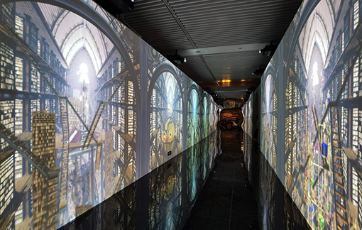 在完成了大量互動體驗環節后,一條光影長廊的出現令每位偵探初學者感嘆于刑偵學的博大精深。5臺索諾克激光工程投影機配合鏡面的反射呈現出了一座仿佛無邊際的藏書閣,不多時畫面又切換至書架間的身體結構圖、動物骨骼圖、植被生長周期特征圖等高清圖像,令人對福爾摩斯先生的崇敬之情又加深了幾分。