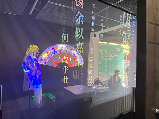 現(xiàn)場(chǎng),索諾克Sonnoc通過(guò)在紗幕上投影書(shū)法文字創(chuàng)造空間感,結(jié)合戲曲主題,將投影精準(zhǔn)地投射在1.6米長(zhǎng)的扇子、戲服及戲曲頭冠上。原本平淡無(wú)奇的折扇、戲服和頭冠,在投影光芒的點(diǎn)綴下,煥發(fā)出流光溢彩的視覺(jué)效果,現(xiàn)場(chǎng)參訪者紛紛拍照打卡。