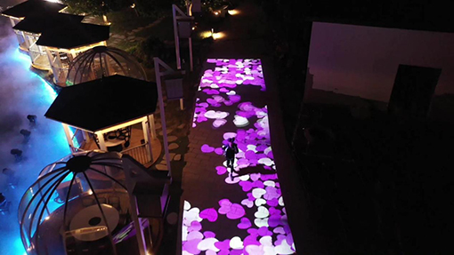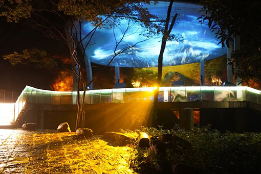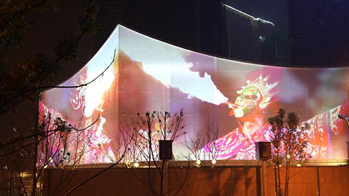 四川成都麓湖林語售樓中心45米×13米戶外樓體秀,通過多臺12000流明索諾克(Sonnoc)投影設(shè)備構(gòu)建裸眼3D