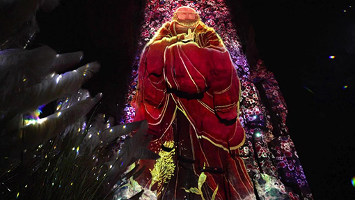南京達(dá)摩光影藝術(shù)館以“光”為核心,打造全國首個以達(dá)摩為主題的洞窟實(shí)景光影秀和24米巨幅達(dá)摩像,索諾克(Sonnoc)5,000~8,000流明激光投影機(jī)通過多機(jī)融合技術(shù),在石窟內(nèi)壁投射超大沉浸式畫面。天然洞窟壁面凹凸不平,導(dǎo)致投影畫面無法自然融合,需反復(fù)調(diào)試以尋找最佳顯示區(qū)域,索諾克(Sonnoc)技術(shù)人員采用洞壁結(jié)合紗幕的方式,補(bǔ)平凹凸不平的表面,形成平整的虛擬成像面,確保了畫面的完整性,并通過反復(fù)測試不同投影角度最終實(shí)現(xiàn)自然融合的光影效果,重現(xiàn)“一葦渡江”的禪意故事。