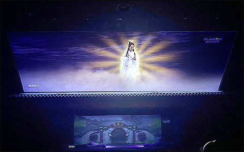 劇場采用了上下幕結合、幻影成像、演員互動演繹的形式。投影場景共分為三個部分,分別是主舞臺上方的天幕,舞臺中間的幻影成像,以及舞臺后方的場景切換投影區(qū)域。