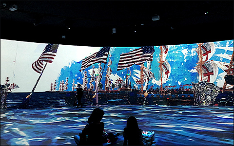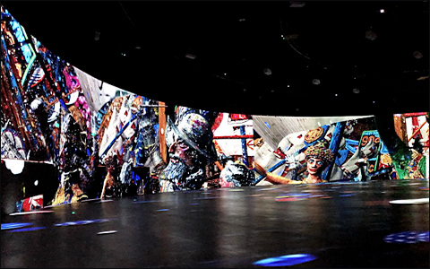 這是海南省首個360°數(shù)字媒體藝術館,直徑30米的環(huán)幕,展出以廖曉春的《重啟》和費德里科·索爾米的《大鬧劇》為主要內(nèi)容與觀眾進行互動展覽。