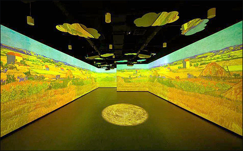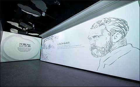 “光影之旅”是一個沉浸式互動空間,由序廳和主廳構成,投影區(qū)域包括了序廳2個墻面,主廳5個墻面,以及互動區(qū)域的一個地面,可以瞬間帶領游客進入“人在畫中央”的情景中。