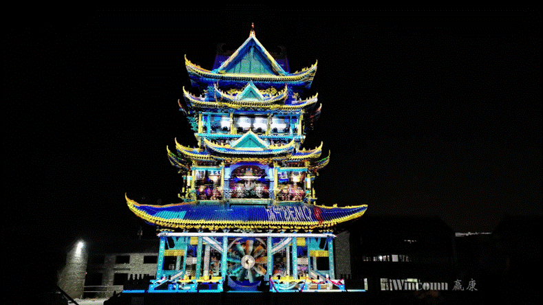 贏康為縉福樓投影秀提供了數(shù)臺20000流明的激光投影機,讓贏康制作的影片清晰呈現(xiàn)在結(jié)構(gòu)復雜的古建筑樓體上,綺麗奪目,成為了太平古城夜游演出的“明星”項目。