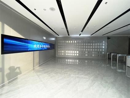 首先,是針對大廳入口的顯示系統完成了升級改造工作,通過OLED透明拼屏搭建顯示系統,確保每個顯示屏的無縫拼接和精準對齊,并對顯示屏的畫面進行調整校準,最終確保顯示系統內容流暢精準,畫面精美清晰,從視覺層面來看,顯示系統帶來了令人驚艷的效果,與整體空間實現了和諧統一,營造出濃厚的科技感與智能感氛圍。