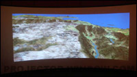 正前方的主屏幕是高清疊加系統(tǒng),左側(cè)依次展示了正投弧形幕系統(tǒng),立體投影系統(tǒng),背投弧形幕系統(tǒng)等,分別展示了松下PT-DZ12000投影機(jī)、松下PT-DW10000C投影機(jī)、松下PT-D12000投影機(jī)、PT-FDZ680投影機(jī)、PT-FDW630及松下PT-FD600