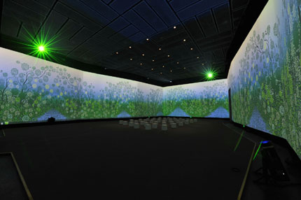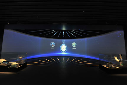整個展示中心以“時空之眼”的紗幕投影系統拉開序幕,“時空之眼”位于序廳的中心,同時它也是該企業展示中心的精神內核。時空之眼中心造型由大LED球、紗幕、地面LED幕以及9個內投小球組成,采用4臺松下液晶投影機PT-SLX12K,4臺松下DLP投影機PT-FDX90L,并配合使用180度弧幕投影,投影畫面總高度為12.4米。它通過藝術多媒體的影像裝置,意象地表現企業產品、企業品牌和企業文化在世界的地位和影響。