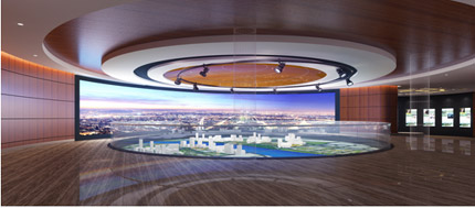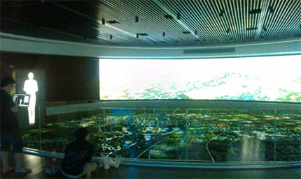 該系統采用4臺松下PT-FDX91CK+變焦鏡頭ET-DLE150,運用半球幕多通道投影方式,配合具有未來感的駕駛艙設計,通過虛擬漫游的方式向觀眾展現海創園概覽、西溪濕地等極具賣點的優勢。創業、工作、生活氛圍都將通過體感虛擬漫游與參觀者進行互動,將海創園的優勢放大,讓人們在游戲的同時加深對海創園的印象。同時,更可貴的是具有3I特性——沉浸感、交互性和構想性,使得沿用固定漫游路徑等手段的其他漫游技術和系統無法與之相比,能使用戶具有身臨其境的沉浸感。
