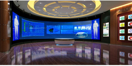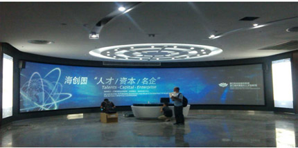 該區是由一塊大型弧形幕及數字沙盤組成,采用5臺10000流明松下PT-FDX110C和20臺8200流明松下PT-FDX91CK,多臺單芯片DLP工程投影機在多種投射方式下融合校正成為其一大特點。為克服復雜的安裝環境對光路的阻礙,安恒技術團隊特別配合長焦鏡頭ET-DLE350C及0.8短焦鏡頭ET-DLE055C來使用,使投影畫面準確、清晰投射至成像屏幕。同時還運用一臺PT-FDX91CK+變焦鏡頭ET-DLE080C設計全息投影虛擬講解員,將觀者帶入栩栩如生的參觀氛圍,讓觀眾置身于流光飛舞的現實,在有限的時空內加深了對區域的了解,對未來的海創園有了一個完美的印象,并沉浸于高科技演示帶來的藝術享受之中。