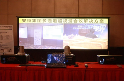 該展項使用兩臺松下液晶工程投影機PT-SLZ66C,采用正投融合投影方式,結合可提供完整的會議室寬屏幕顯示投影解決方案的BAVG處理器,輔之以AW系列攝像機和HDVC