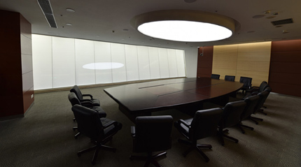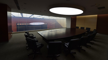 帶著這樣一個疑問,我們細細觀察,來一探究竟。不難發現,在辦公大廳的頂棚,安裝有4臺投影機,這便是由安恒集團代理的松下激光工程投影機PT-FRZ68C。可是新的疑問又產生了,這臺投影機投射的屏幕在哪里呢?原來奧秘就在會議室的大落地玻璃窗。