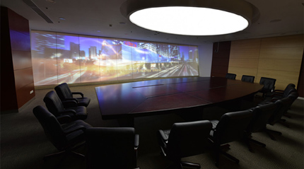 落地玻璃窗使用了調光玻璃技術,當未通電時,玻璃窗呈透明狀態,辦公區全景清晰可見;當接通電源時,玻璃窗呈不透明狀態,滿足了投影成像的需求。兩種狀態可以自由切換,簡單方便。這套投影系統采用4臺PT-FRZ68C激光投影機通過吊裝背投融合,將原本靜態的玻璃窗變成一副動態的立體影像,在節省了空間的同時,帶來了絢麗多彩的視覺體驗。創意十足的投影系統為傳統會議室增添了許多科技元素。