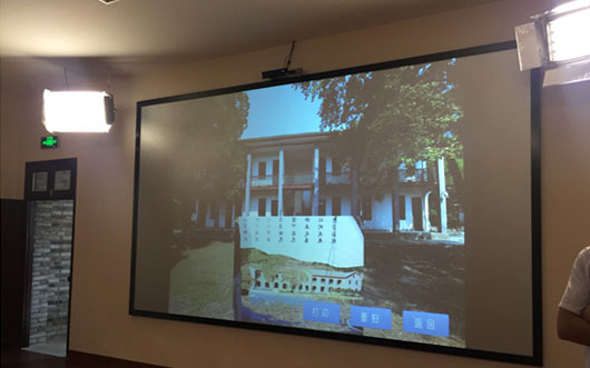 投影機正投。讓人覺得新奇的是,剛剛拍攝的照片會在幾秒鐘之后顯示到旁邊的屏幕墻上,屏幕墻上的照片可以隨時變換,游客可以選擇很多關于春暉學校歷史與景觀為場景拍照留念,點擊打印還能快速打印出照片。