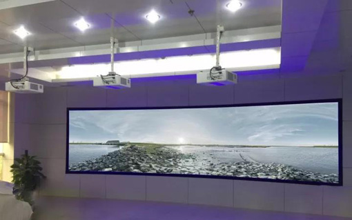 隨著多媒體投影技術的不斷發展的時代,會議室已經漸漸地淡忘了豆腐干大小的投影幕(常規的是電動幕或者拉線幕),取而代之的是更大氣的弧幕、環幕投影。在廣州市政務服務中心大會議室,由3臺索諾克Sonnoc投影機通過完美融合打造的弧幕系統,為每一位參會人員提供了超大畫面、更寬的視野、更多的顯示內容、更高的顯示分辨率,以及更具沖擊力和沉浸感的視覺效果。