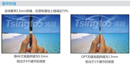 1.5mm無縫液晶可謂是清投2013年明星大作,面世以來受到市場與客戶的火熱追捧。無縫液晶采用全球獨創的OPT光學處理技術,首創液晶拼接1.5mm拼縫,極大地提升了液晶拼接的顯示效果。OPT技術打造的至臻完美的拼接效果可適用于多種應用場合,如視頻監控、精密圖文顯示、會議系統、金融數據顯示等。