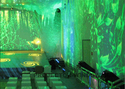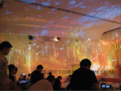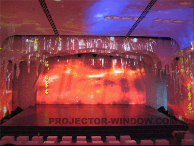 20000ANSI流明的高性能投影機,四臺投射頂棚天幕,兩臺投射舞臺前幕,四臺投射兩側側幕,通過媒體服務器的融合校正及同步播放功能,將側幕、天幕、舞臺前幕以及地面的影像完全融為一體,使得劇場整體營造出一種“沉浸式”的視覺體驗。