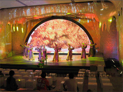 贏康科技公司文體事業部副總經理李玉強先生說:“打造天幕劇場的難點是幕布形狀不規則,融合校正處理難度大,信號源需要同步播放,復雜的現場特效需要處理等等。作為擁有十余年的音視頻系統專業項目經驗的公司,我們全程設計和實施了該項目,效果出眾,使之成為該旅游圣地的一個亮點!