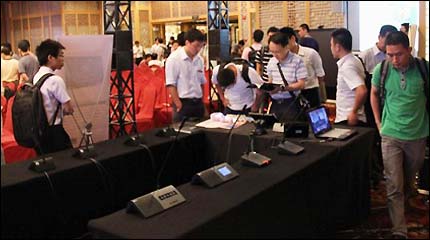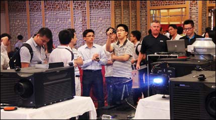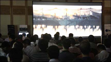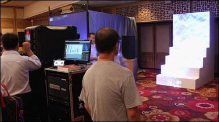贏康立體仿真整體解決方案展區人頭攢動,此次展出的仿真整體解決方案是工業設計方面的內容,完全是由贏康自主制作,并首次采用了攝像跟蹤定位系統。觀眾戴上六點定位眼鏡,手持遙控手柄,就可以非常直觀地互動控制3D影像,比如拉近,放大,縮小,翻轉,甚至虛擬“拆卸、裝配”等等,專業性和趣味性大大提升。據了解,該系統采用了科視Mirage投影機和dnp新一代背投屏幕Zenith,并集成其他頂級跟蹤設備和軟件,可非常專業地實現虛擬樣機展示和互動,在工業設計,軍事仿真,醫療研究有極大的應用價值,吸引了專業客戶、設計研究人員和業界人士的目光。