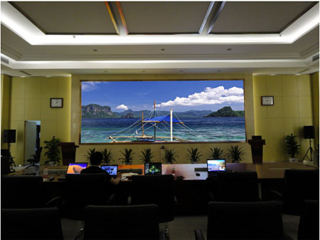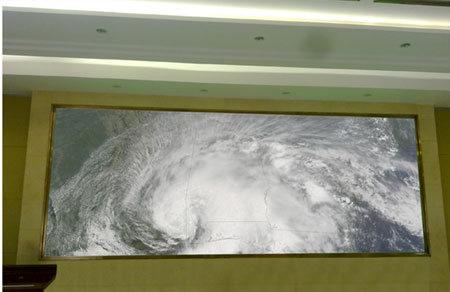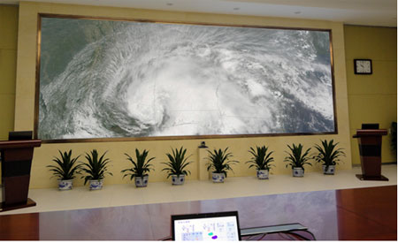8米×3米的顯示系統為全高清設計,可以自由開設多個16:9或4:3的顯示窗口,也可全幅顯示畫面,通常用于顯示實況觀測圖、氣象衛星云圖、各地氣象站的地面和高空觀測數據、實時天氣現象、數值模式和氣象信息綜合分析處理系統等;同時也用于日常會議商討,顯示PPT文件和視頻會議影像等。