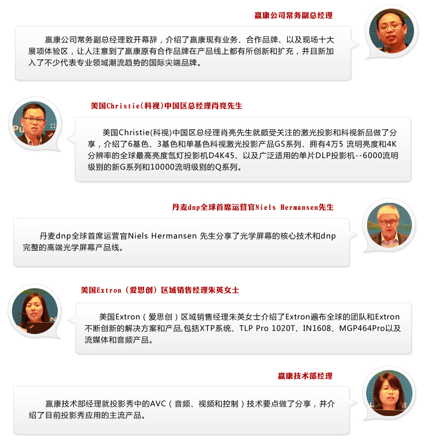 本次贏康巡展,展出陣容盛大空前,匯聚了贏康合作代理的來自美國、丹麥、奧地利、英國、俄羅斯、德國、法國等全球領先的專業A/V品牌,以及贏康自主開發的娛樂互動產品,在現場搭建的十個體驗展示區,充分展示了各個品牌產品的亮點和特色,引發了現場觀眾的爭相觀看和互動交流。