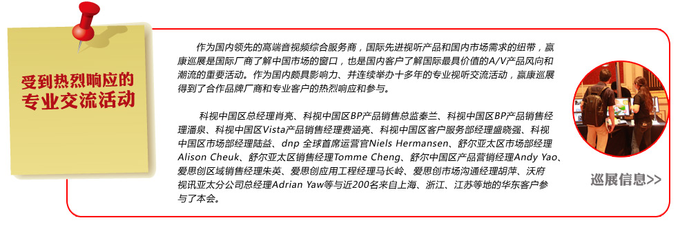 贏康高端音視頻解決方案全國巡回體驗會在上海正式起航,以創新設計的活動規劃、潮流之巔的品牌展示、前沿主流的產品應用、品牌高管的主題分享,再次掀起視聽風暴。