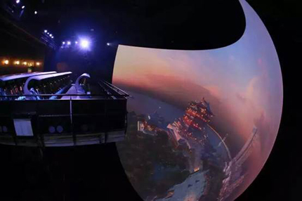 飛行影院乘騎設(shè)備采用Simetec懸空式6自由度動(dòng)感平臺;球幕直徑20米,高度為15.8m;采用數(shù)臺科視4K分辨率35000流明高亮度投影機(jī);數(shù)臺7thSense無損媒體播放器;17.1聲道擴(kuò)聲系統(tǒng);Alcron表演控制系統(tǒng)。