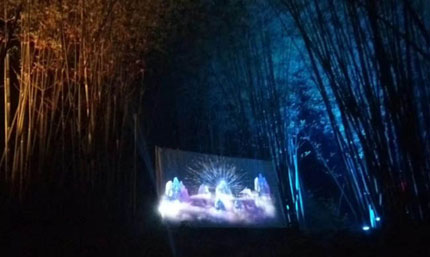 為了使整個項目完美呈現,贏康在近兩公里長的游覽線路上,配置了數臺10000流明到35000流明亮度的科視投影機,將視頻影像投映在山體上,竹林中,瀑布上,紗幕中。同時,為確保完美投影的顯示效果,除了性能卓越的“科視”投影外,贏康還為投影系統特殊定制了具備防水,防潮,防雷擊等專業特點高科技戶外投影恒溫箱。并通過業內最為先進的英國7th