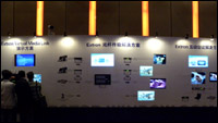 會議現場,包括一些新品在內的產品做了大型的分區展示:A區是位于主席臺正前方,由超高視角的250英寸Stewart背投軟幕和Barco