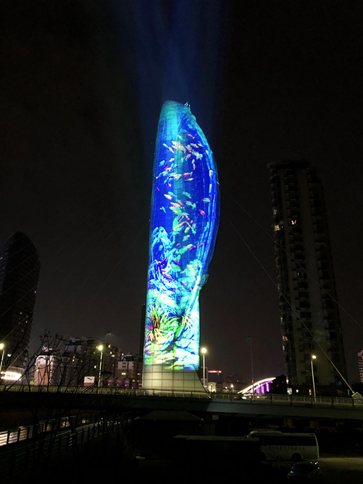 在投影設(shè)計上,該建筑體大部分區(qū)域是玻璃幕墻,對光損失大,影響投影畫面質(zhì)量。所以贏康在投影設(shè)計和安裝方案上進行了有針對性的優(yōu)化,以減小玻璃幕墻對投影畫面的影響。投影設(shè)計完成后,影片畫面在玻璃體上得以完美、精準呈現(xiàn),保證了演出畫面的高質(zhì)量呈現(xiàn)。