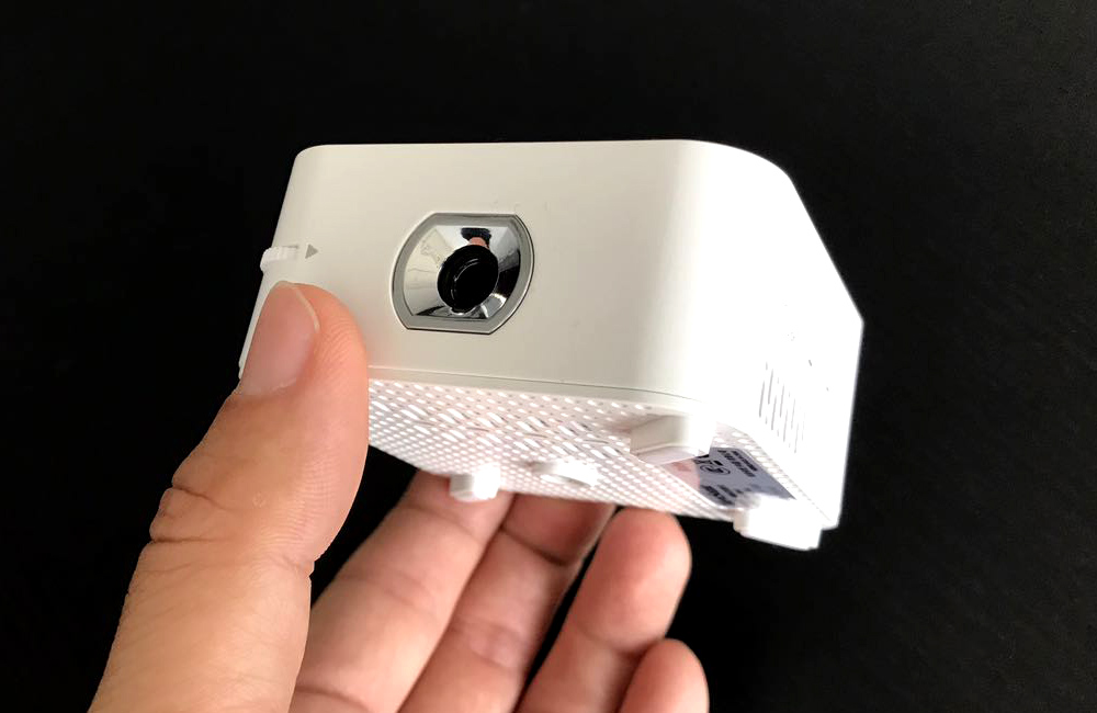 Baby Vision 機(jī)身一側(cè)是按鍵(四個(gè)按鈕),觸感清脆;另一側(cè)是接口,非常簡(jiǎn)單,讓投影擺脫線的困擾。鏡頭旁邊有一個(gè)小旋鈕可調(diào)整聚焦。