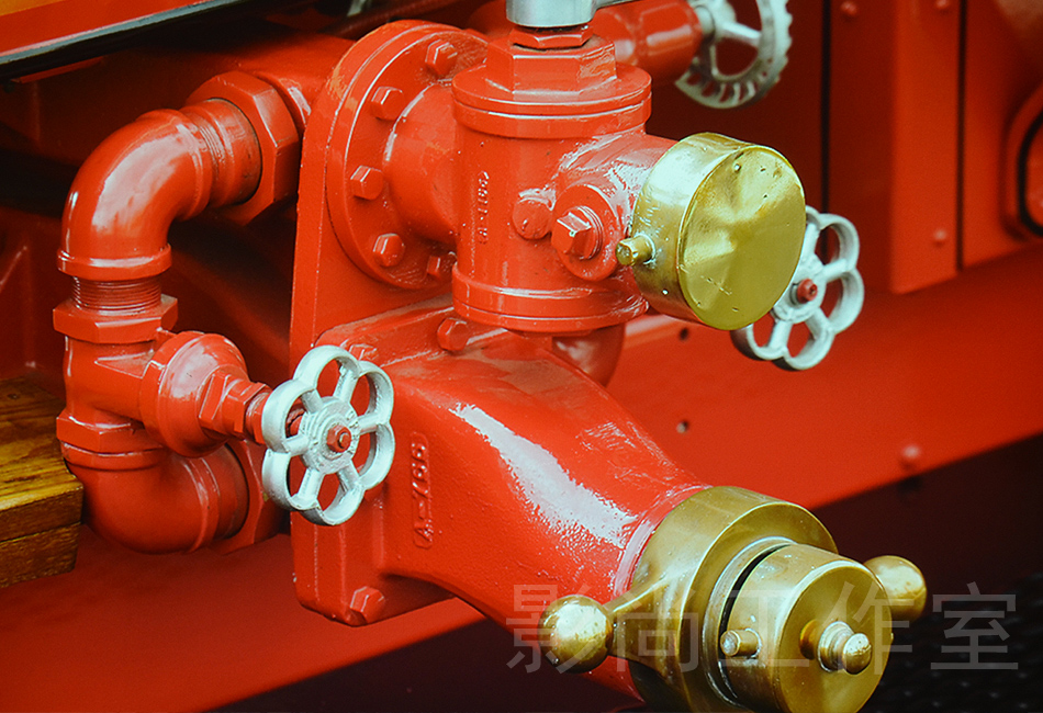 管道的光澤與痕跡非常細膩,紅色與金、銀色對比強烈