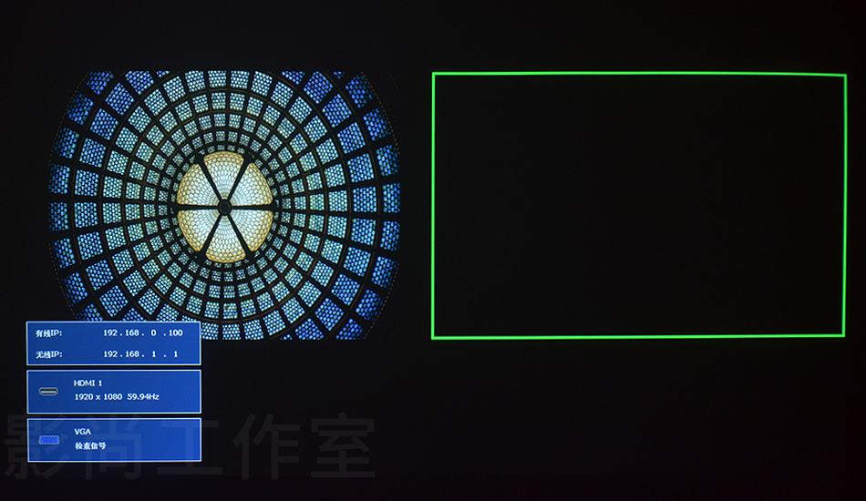 這次工作室來了一個“大塊頭”,20600流明高亮度真的達到了“令人眼前一亮”的字面意思。此次特意選擇了0.6:1投射比短焦魚眼鏡頭,鏡頭安裝方便,輕松搞定,在近距離將整面墻壁全部覆蓋影像。我們播放了測試視頻,恢弘氣勢得到很好的呈現,高亮度加上雙色激光光源的畫質確實很吸睛,在觀看電影片段時讓人不忍離去。