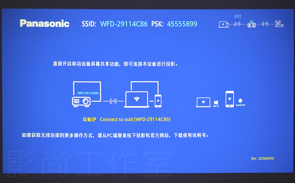 無線投屏功能是松下PT-WZ4000的一大亮點,得益于Miracast協(xié)議以及5GHz/2.4GHz雙通道,我們實測它的連接速度和穩(wěn)定效果都很不錯,而且非常簡潔方便。此外,其還可直讀U盤中的圖片進(jìn)行投影
