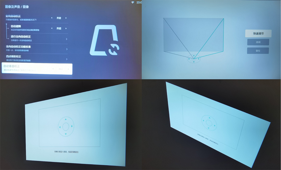 在相對較狹窄的居家投影場景中,幾何校正是極為常用的功能。小明Q2搭載了全向自動校正AI算法,在筆者實際體驗中小明Q2幾乎全是以側投形式展示畫面,顯示結果也盡如人意。此外,我嘗試了手動調節小明Q2的四角校正值,可以看到可調節的角度范圍極大,即便是實際使用中對畫面顯示有一些特殊需求,小明Q2也能輕松應對。