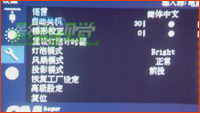 SCP716主菜單下分4部分,分別是:輸入菜單、圖像菜單、設置菜單和信息菜單;輸入菜單是選擇需要的輸入信號源;圖像菜單分為:圖像模式,亮度,對比度,顏色,色彩,銳度,降噪,長寬比,高級設定和復位;設置菜單分為:語言,自動關機,梯形校正,重設燈泡計時器,燈泡模式,風扇模式,投影模式,恢復工廠設定,高級設定和復位;信息菜單分為:輸入分辨率,水平頻率,垂直頻率,燈泡使用時間和System