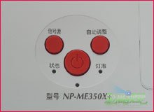 ME350X+ 為達到大氣美觀的效果采用耐磨耐臟中國紅按鍵,三個按鈕分別為信號源、自動調整以及開關,其余功能需要靠遙控器來控制。