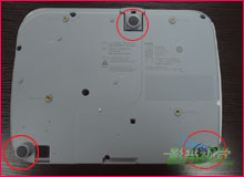 ME350X+精細化設計處處體現。底部有三個支架(用紅色圈出),可以分別升高或者降低以適應不同的地形來放置投影機。