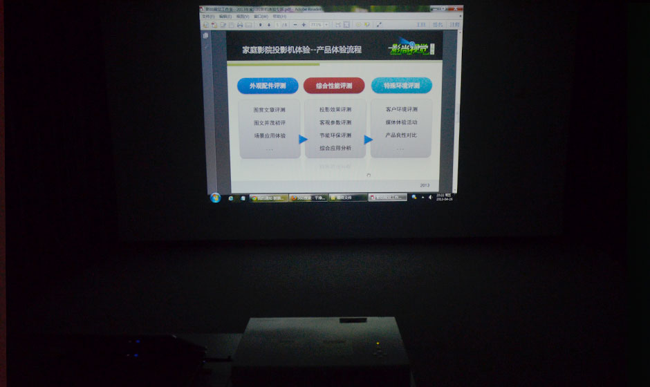 測試畫面——常用辦公軟件測試,PDF文檔測試,C3270的投影距離中規(guī)中矩,不過文檔顯示效果還是值得稱贊的。(畫面大小150寸)