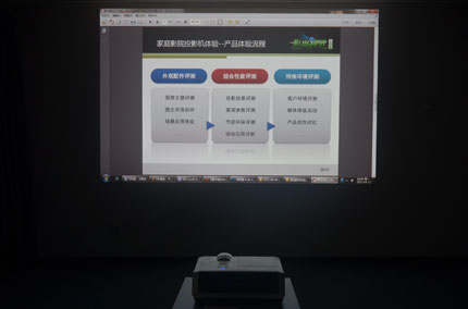 在這一環節中,我們仍舊對其進行了最為常用的各類辦公軟件界面的投影,包括Office軟件、網頁瀏覽、設計軟件、PDF文檔、作圖軟件等等,模擬全黑環境與實際使用環境兩中不同的應用環境對其投影效果進行了全面的觀察與體驗。在投射120寸畫面時,全黑環境中能夠達到非常出色的畫質表現,說其為精品辦公演示利器一點也不為過;當周圍環境為正常光照效果時,PJWX3340N