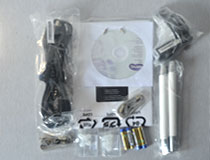 打開簡單的包裝之后,我們能夠看到這組為課堂應用專門定制的紅外互動模塊的所有組件,包括PointWrite模塊主機1臺、PointWrite筆兩只、螺絲兩枚(安裝在投影儀)、AAA電池4支、替代筆尖5個、USB電纜一條(5米,minB