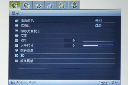 MX661的菜單設計延續了明基一貫的菜單設計風格,整體分為顯示、圖片、音頻設置、系統基本設置、系統高級設置、信息共六個主菜單,每個主菜單下面分別設立相關的設置項目。顯示設置主要為寬高比、體型校正、數碼變焦等設置項;圖片設置能夠設置投影的亮度、對比度、清晰度、色溫等設置;音頻設置主要是音量與開關機提示音設置;系統基本設置包含語言、投影機位置、菜單、輸入信號源等設置;系統高級設置包含燈泡設置、波特率、高海拔模式、復位等設置;信息菜單包含了投影機的一些參數信息。