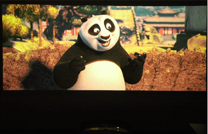 很大影響。在明亮環境下尚且如此,在黑暗中的顯示更可謂華麗。百寸大屏的每一個畫面都有著鮮艷的色彩,尤其有著濃郁的紅色。此外,我們在觀賞具有較多暗景的畫面時,暗場層次依然分明,如右圖中夕陽下山林中的每棵樹的樣子可以盡收眼底。 |