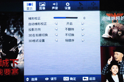 INESA“晶綻”激光電視在操控上采用簡潔,明朗的菜單化方式,顯示、圖像、聲音、設置四大項在菜單頂端,配合簡易圖片標注,讓人一目了然。在設置選項中,用戶可以根據房間燈光和喜好進行亮度、對比度、色度等多種圖像參數調整,INESA還直接配置好了適合不同場合觀看的模式,如標準、柔和、明亮、用戶、電影、演示供選擇。
