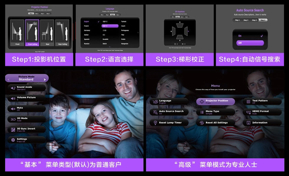 在交互方面的最大嘗試,從綜合使用體驗來看,這中簡易化菜單風格帶來用戶體驗的提升還是十分引人注意的,尤其是對于初次使用投影機產品的用戶而言,類似于“下一步”、“下一步”、“下一步”形式的設置步驟讓用戶初次安裝變得更為簡單高效,也讓